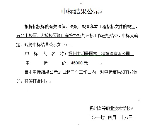 绿化养护中标结果公示