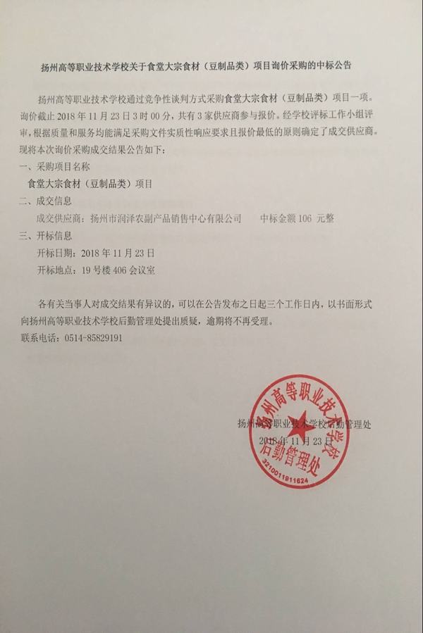 关于食堂大宗食材(豆制品类)项目询价采购的中标公告