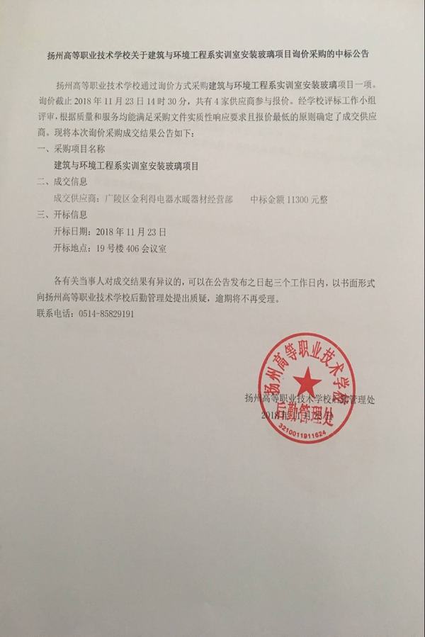 关于建筑与环境工程系实训室安装玻璃项目询价采购的中标公告