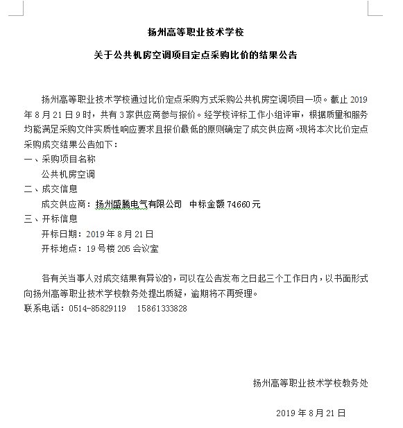 扬州高等职业技术学校关于公共机房空调项目定点采购比价的结果公示