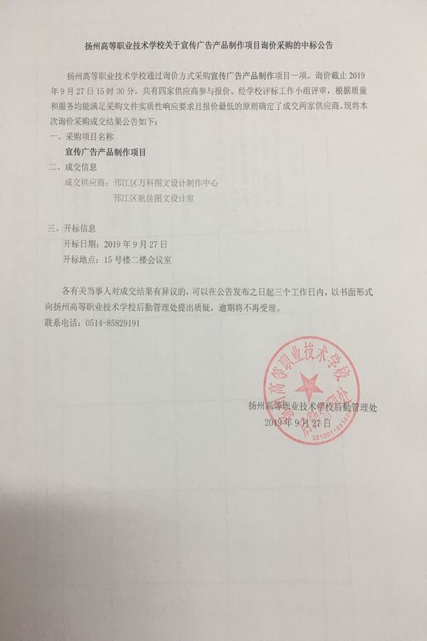 扬州高等职业技术学校关于宣传广告产品制作项目询价采购的中标公告