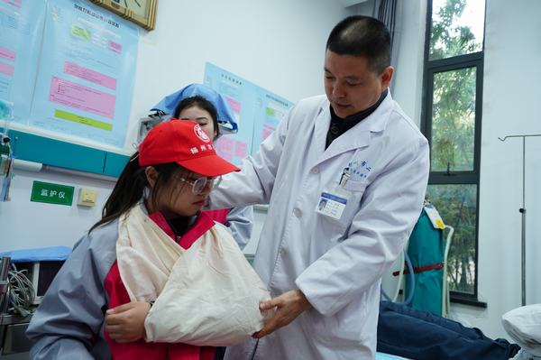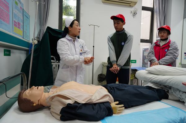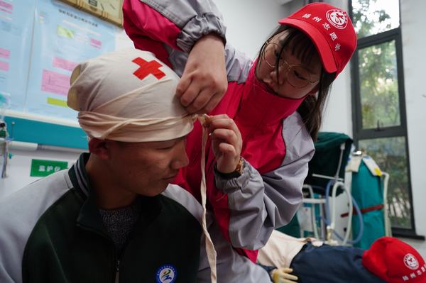 活动中,医院护士长邵菲向同学们阐述心脏复苏的操作要领和注意事项,并演示各项操作流程:首先要迅速判断患者反应,检查是否呼吸异常,同时判断有无脉搏,动作要在5到10秒内完成;若确定心脏骤停诊断后,向周围人呼救并拨打120后,立即开始心肺复苏。在她的指导下,志愿者们轮流实践操作。随后,邵菲介绍了除颤仪的使用方法,引导志愿者亲身参与操作。活动还专门邀请了外科医生为大家演示三角巾包扎法。在操作过程中,志愿者们踊跃参与,遇到问题及时向医生求助,现场气氛活跃。