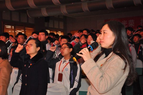 入团仪式在庄严的国歌声中拉开序幕。在全校师生的见证下,教师代表为新团员佩戴上闪耀夺目的团徽。伴随着雄壮的团歌,在鲜艳团旗的映照下,周劼带领新团员宣誓,新团员发出庄重的誓言:“我志愿加入中国共产主义青年团,坚决拥护中国共产党的领导,遵守团的章程……共产主义事业而奋斗!”铮铮的誓言表达了对共青团组织的无限向往和为团组织增光添彩的豪迈激情。