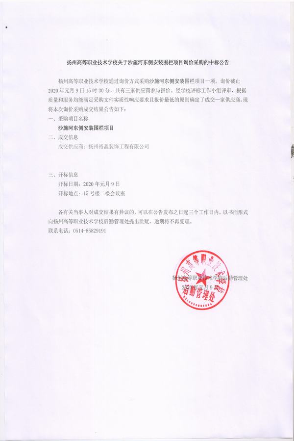沙施河东侧安装围栏中标公告