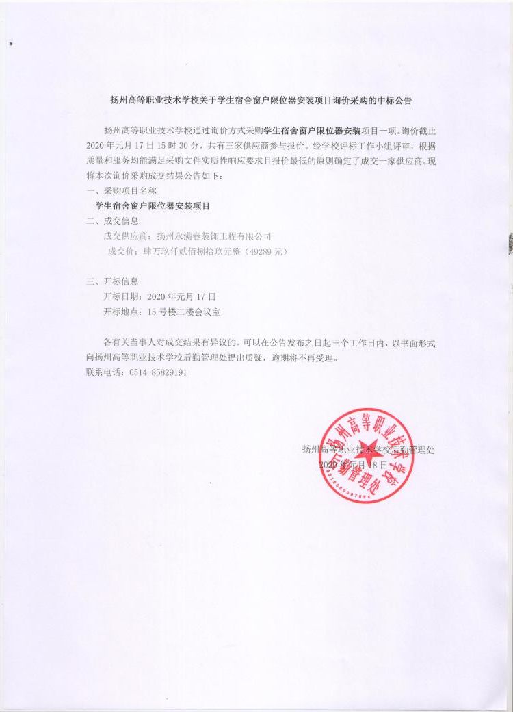 学生宿舍窗户限位器安装项目询价采购的中标公告