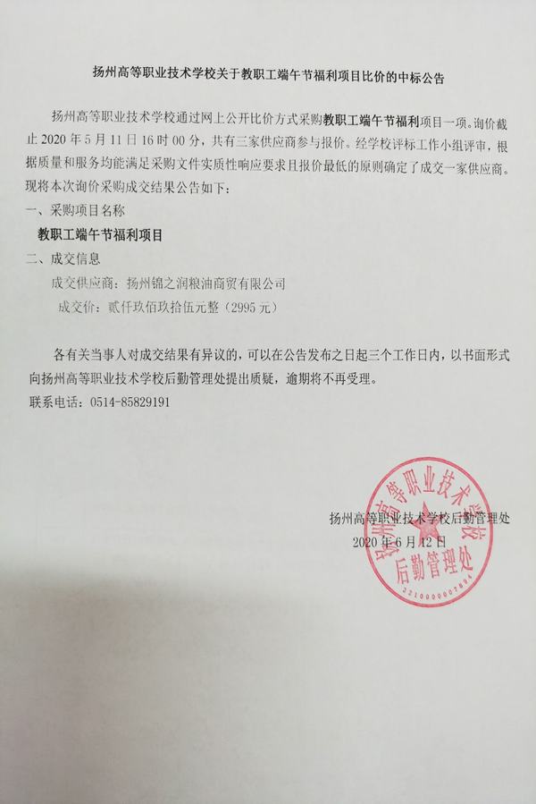 扬州高等职业技术学校关于教职工端午节福利项目比价的中标公告