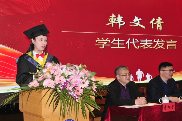 优秀学员代表、计算机科学与技术专业学生韩文倩发言。她代表所有毕业生感谢在校期间所有老师的辛勤付出,感恩母校的培养,她表示将用今天的每一份努力和坚持,迎接明天的每一次机会和挑战,用青春和汗水追逐梦想成就出彩人生。