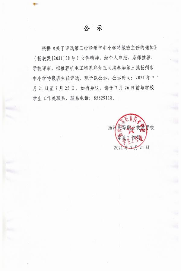 关于推荐郑如玉参加第三批扬州市中小学特级班主任评选的公示