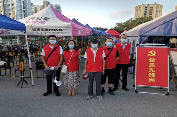 8月5日清晨,机电工程系党支部书记栾玉祥、副书记闵立中、纪检委员夏云、统战委员赵亮以及工会小组长赵云枫五名党员教师早早来到疫情防控点,他们身着志愿服务外套,正确佩戴防护罩、口罩等防护用品,积极认真热情地投入到志愿服务工作中去,仔细进行测体温、查苏康码、核验身份证件、维持秩序等操作程序。责任和担当让胸前的党徽在炽热的阳光下熠熠生辉,汗水伴随着被风吹动的党旗尽情挥洒。