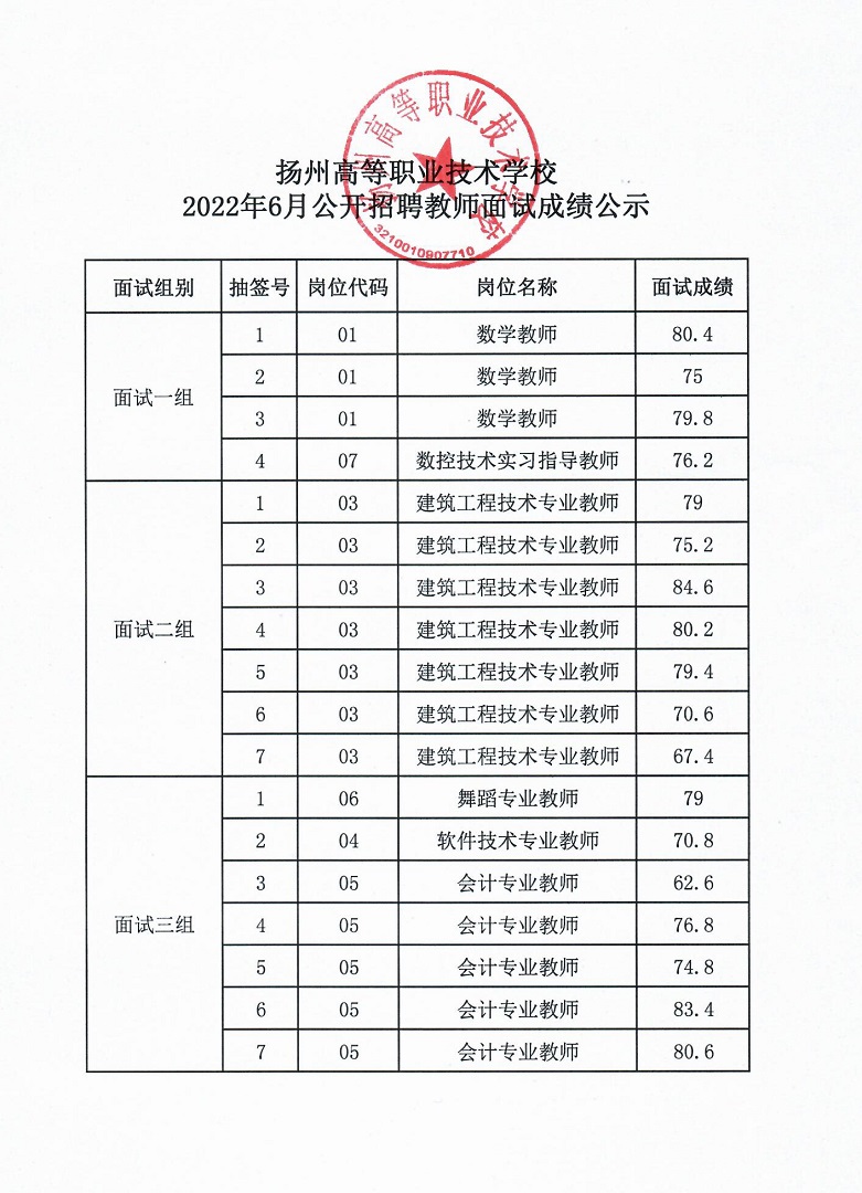 扬州高等职业技术学校2022年公开招聘教师面试成绩公示