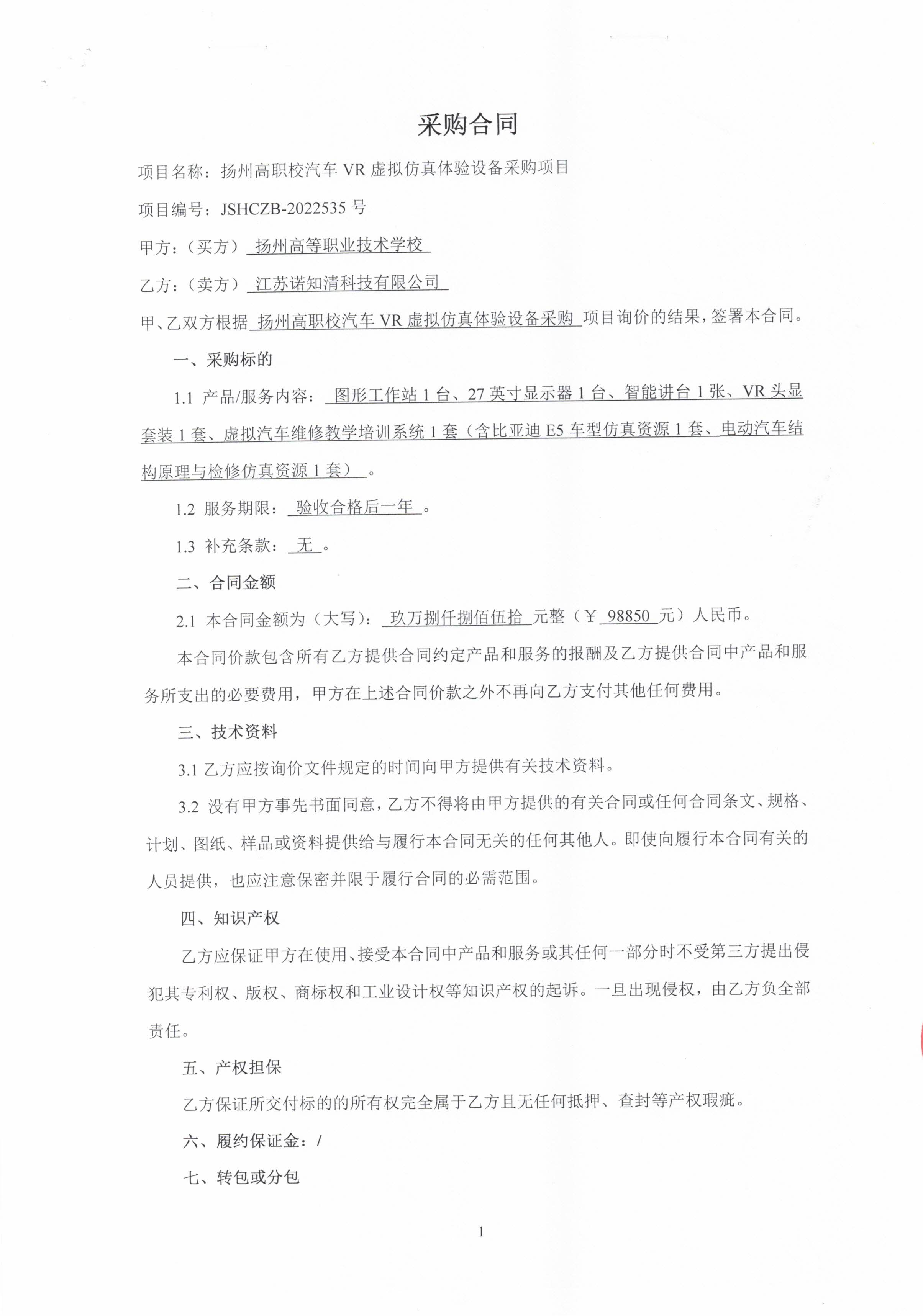 汽车VR虚拟仿真体验设备采购合同