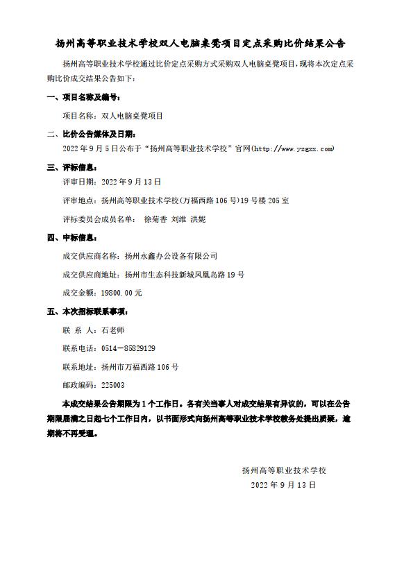 扬州高等职业技术学校双人电脑桌凳项目定点采购比价结果公告