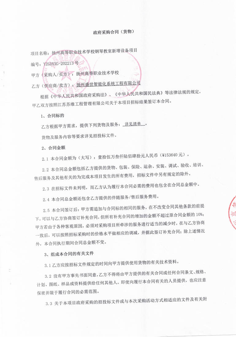 扬州高等职业技术学校钢琴教室新增设备项目合同