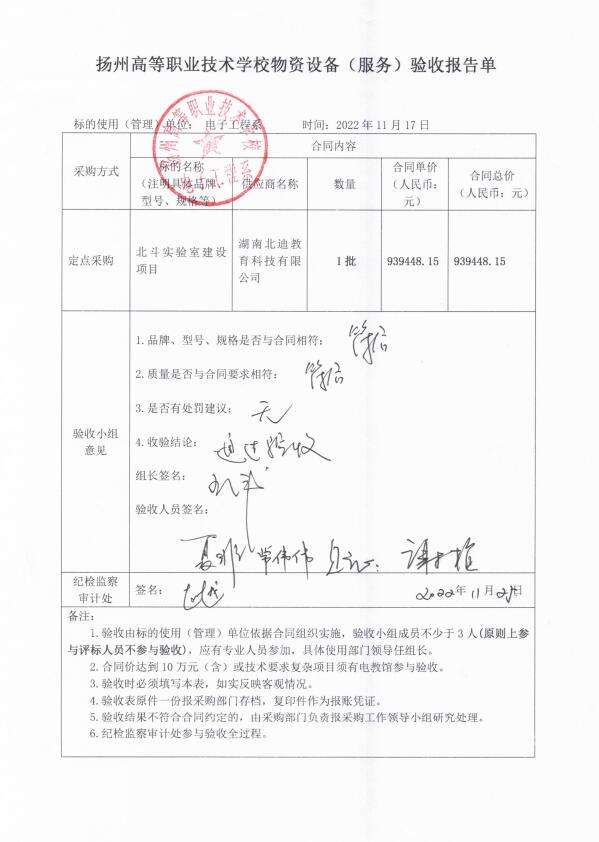 扬州高等职业技术学校电子工程系北斗实验室建设项目验收报告单