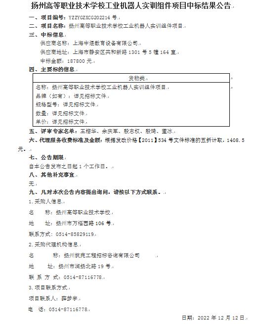 扬州高等职业技术学校工业机器人实训组件项目中标结果公告