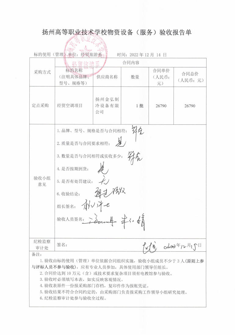 扬州高等职业技术学校经贸旅游系空调项目验收报告单