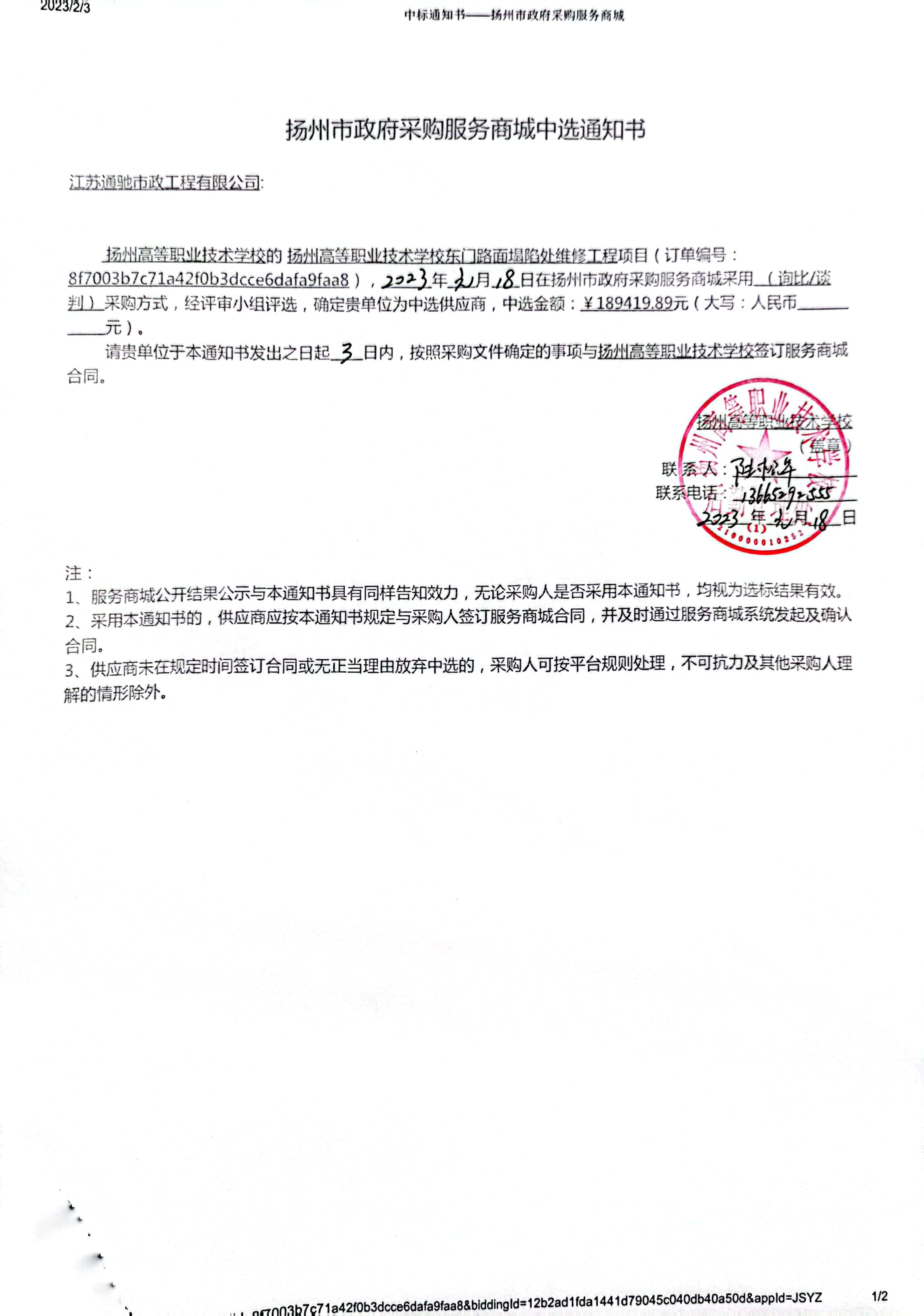 扬州高等职业技术学校东门路面塌陷处维修工程中标公告