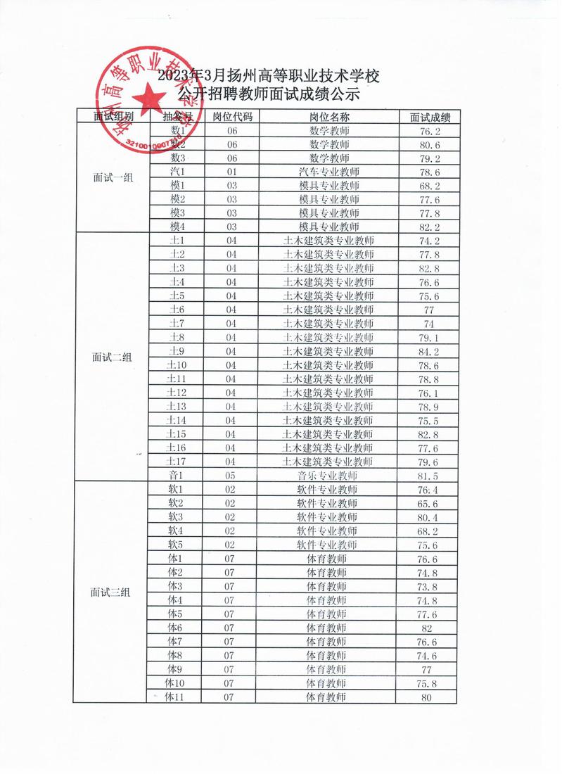 2023年3月扬州高等职业技术学校公开招聘教师面试成绩公示