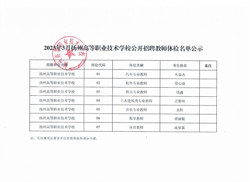 2023年3月扬州高等职业技术学校公开招聘教师体检名单公示
