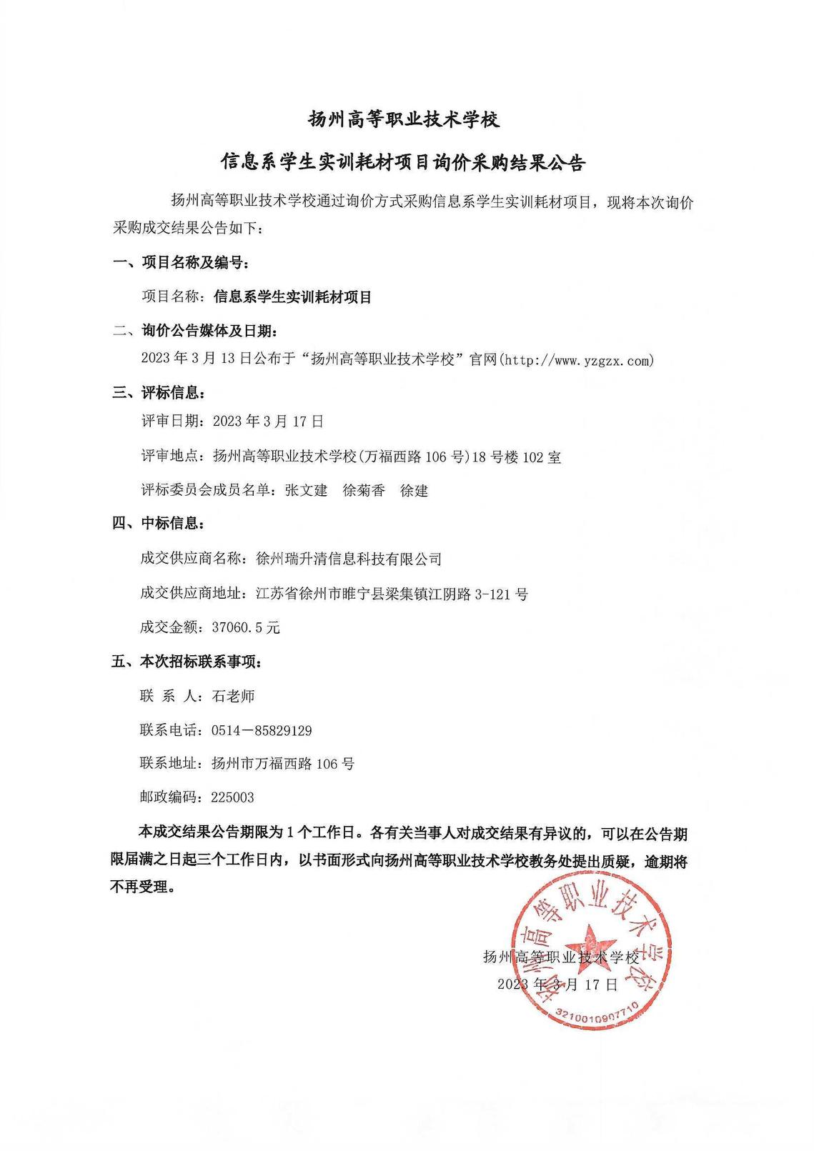 信息系学生实训耗材项目询价采购结果公告