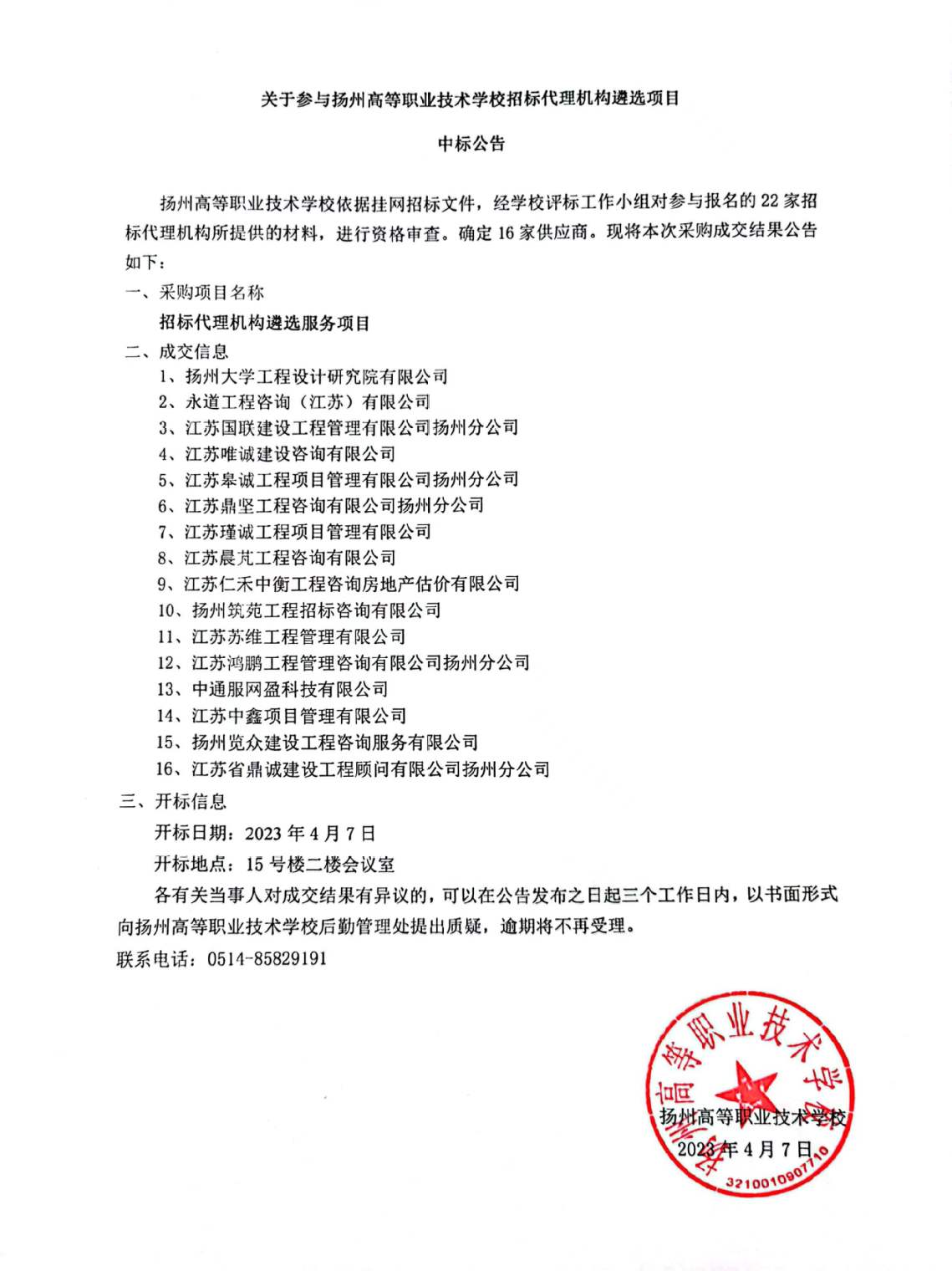 关于参与扬州高等职业技术学校招标代理机构遴选项目 中标公告