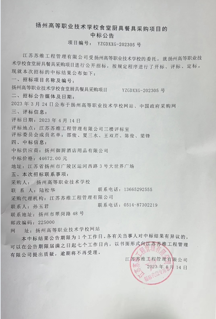 扬州高等职业技术学校食堂厨具餐具采购项目的中标公告