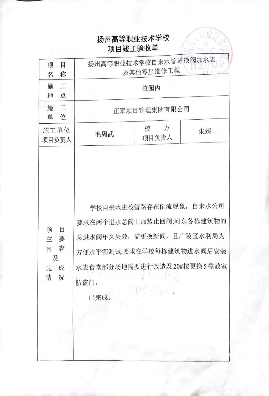 自来水管道换阀加水表及其他零星维修工程项目竣工验收单