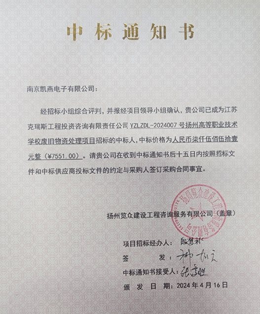 废旧物资处理项目中标通知书