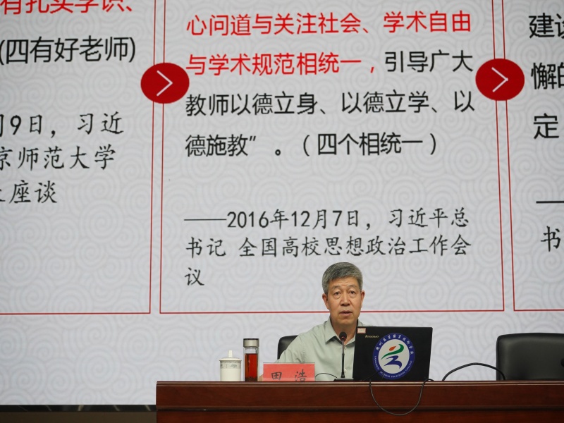 江苏旅游职业学院党委书记田浩以《弘扬高尚师德努力做“大先生”》为题,通过一个个鲜活的案例,生动诠释了师德的深刻内涵。他强调,新时代教师肩负着培养社会主义建设者和接班人的重要使命,需具备大境界、大胸怀、大学问、大格局,不仅要传授知识技能,更要注重塑造学生的品格品行,成为学生成长道路上的精神引路人。