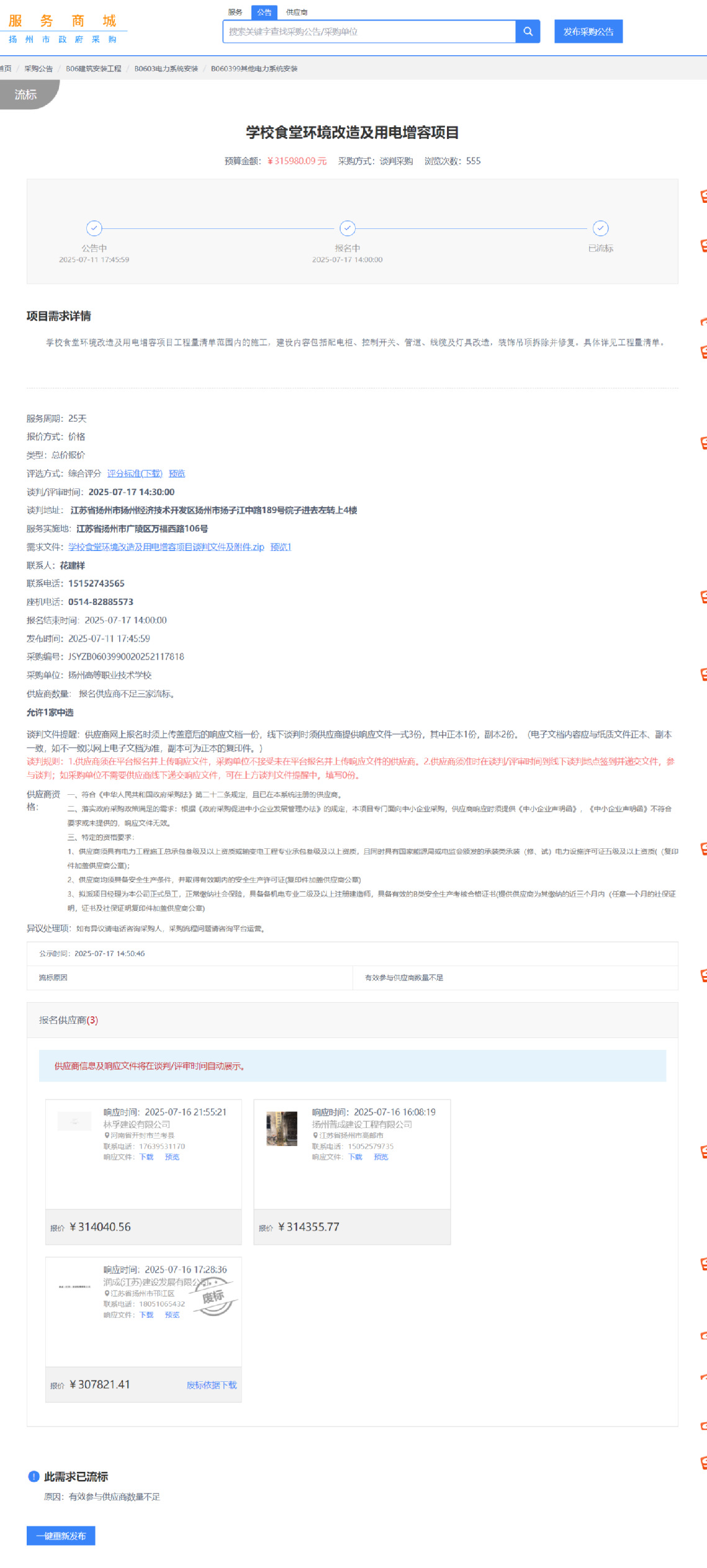学校食堂环境改造及用电增容项目流标公告