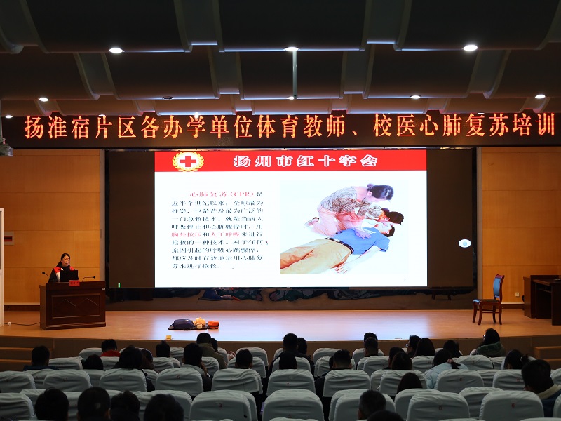 为进一步提高教师在体育教学和运动训练过程中应对突发意外伤害和处理应急事件的能力,增强校医的应急救护水平,降低意外事故的发生,充分保障学生生命安全,12月15日-18日,扬淮宿片区组体育教师和校医的心肺复苏培训及考证工作在我校举行,来自扬州、淮安、宿迁三地21家办学单位185名体育教师和校医参加培训。学校党委委员、副校长徐艳出席开班仪式并讲话。