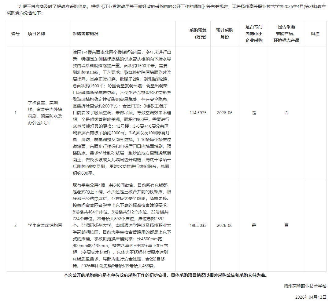 2026年4月(第2批)政府采购意向公告(食堂、实训楼、宿舍等内外墙粉刷,顶层防水及办公区吊顶,学生宿舍床铺购置)
