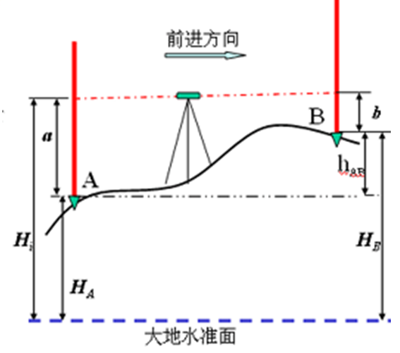 通常水准测量的方向是从已知点到待测点进行的,也就是说已知点始终在待测点的后面。所以,在测量中“后”是指已知,“前”是指待测。在上图中,A点为后视点,读数a为后视读数;B点为前视点,读数b为前视读数。因此,A、B两点间的高差等于后视读数减去前视读数。当读数a>b时,高差为正值,说明B点高于A点;反之,当读数a时,则高差为负值,说明B点低于A点。