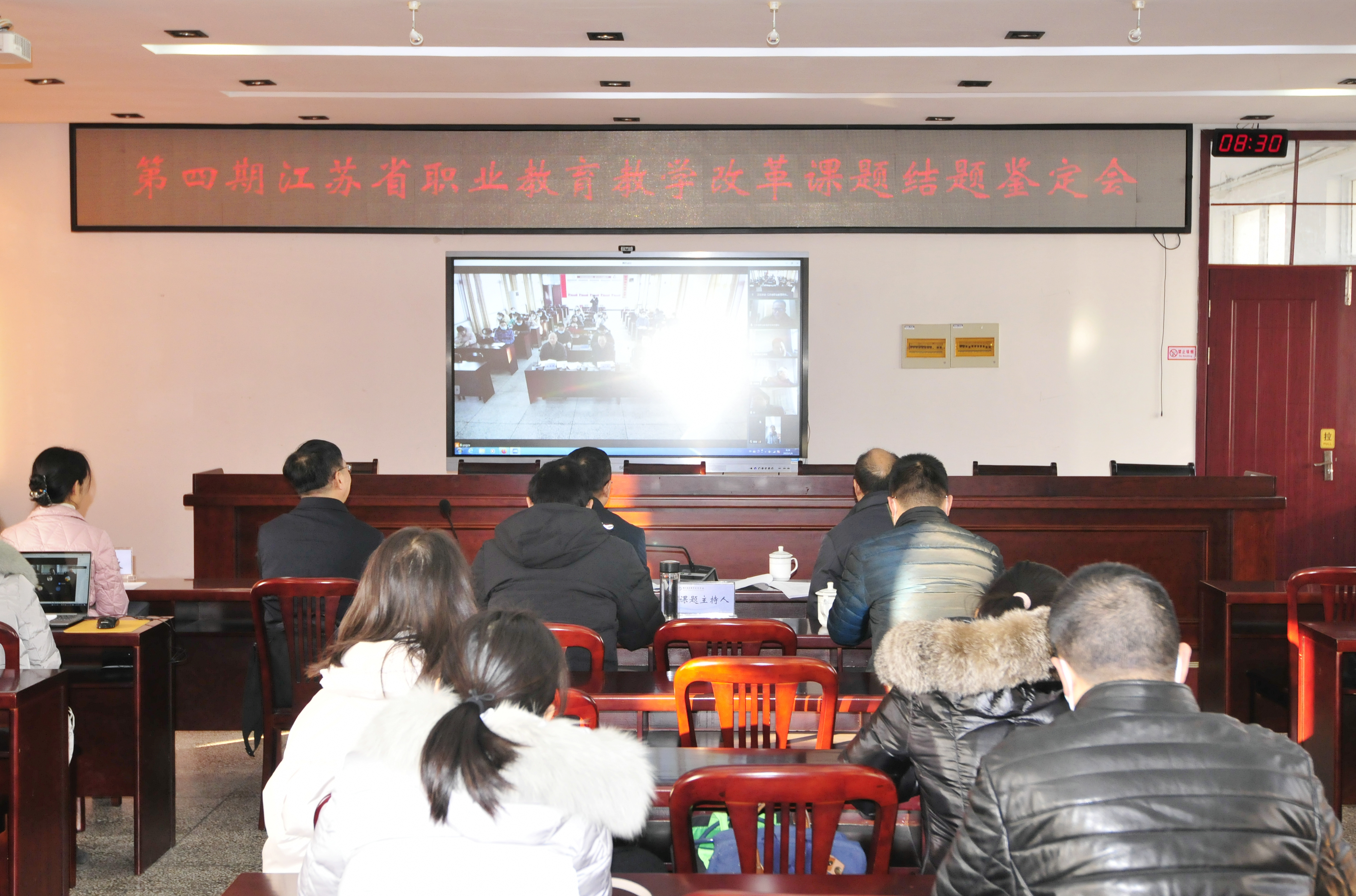 会上,赵杰校长致辞,他向专家组介绍了学校教科研工作开展情况以及十三五以来教科研成果,代表学校对鉴定组专家的到来表示热烈欢迎。江苏省职业教育研究所所长方健华线上讲话,他概述了江苏省职业教育改革研究课题的总体情况、具体特征与研究价值,强调采取省、市、校三级联动强化课题管理,扎实进行过程指导,将课题研究做真、做实,真正开展有质量的教改课题研究。接着八个课题分两组在五楼会议室和四楼会议室进行汇报和接受鉴定。