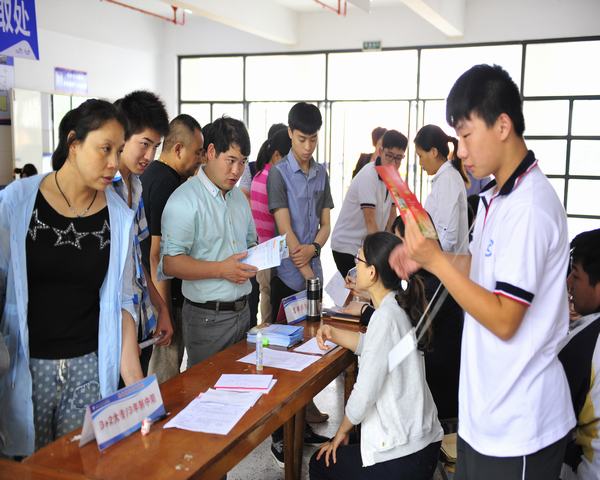 6月28日,我校2015年集中招生报名正式开始,经过一夜雨水洗礼的学校并没有显得宁静,天空不时飘起小雨,来自各地的初中毕业生和家长纷至沓来,报名现场异常火爆。