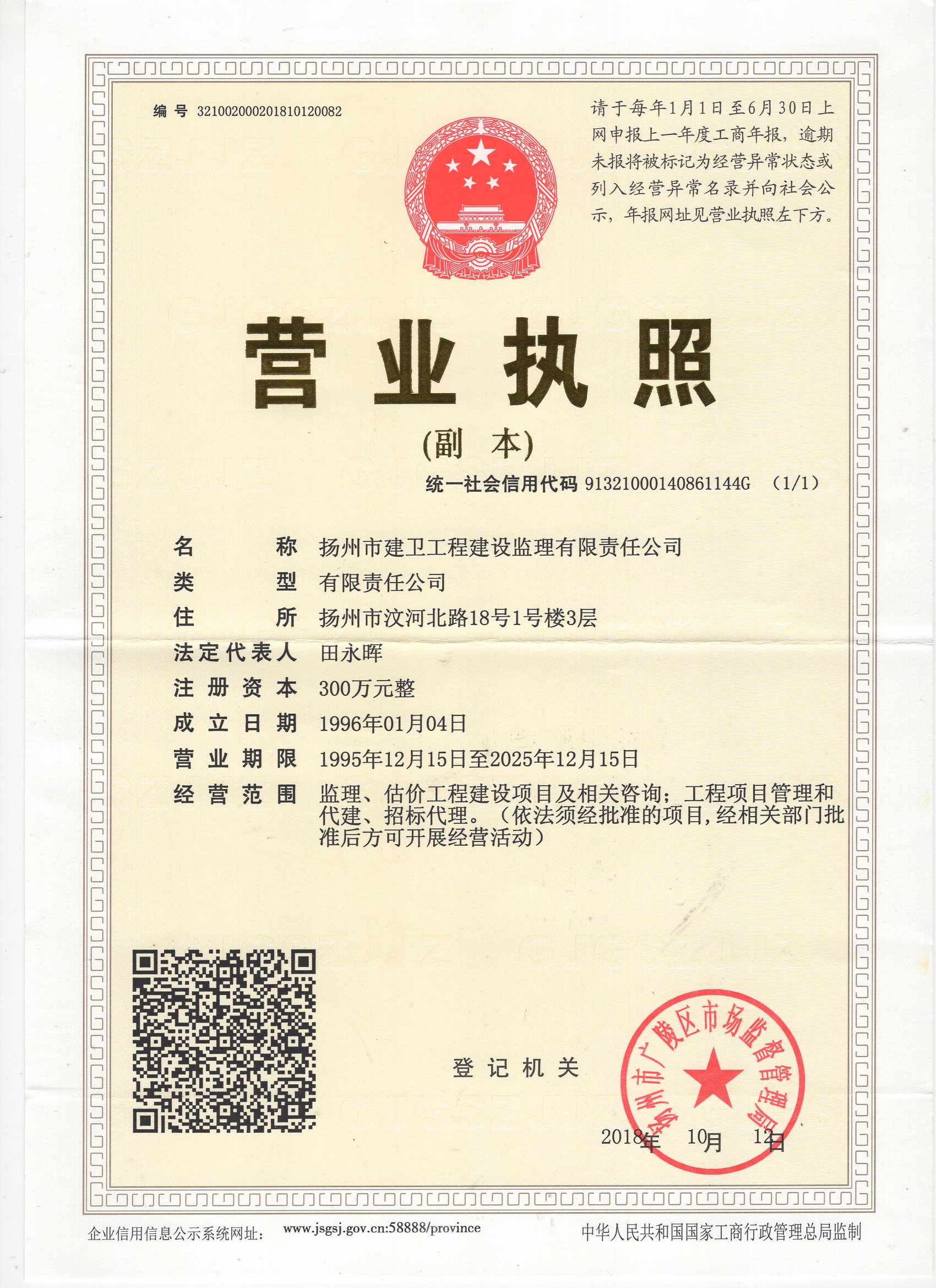 扬州市建卫工程建设监理有限责任公司成立于1996年元月,系扬州市首家正式运营的监理企业,江苏省建设监理与招投标协会常务理事单位,江苏省文物保护团体会员单位。经历了二十多年的积累沉淀,公司资质等级及业务范围不断提升扩展,人员素质及数量稳步增长,已经发展成为了建设领域中真正的“建设卫士”。